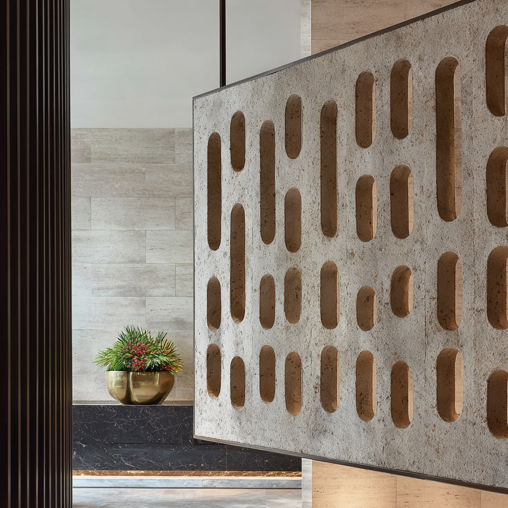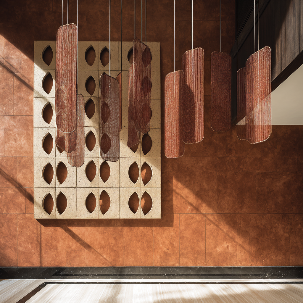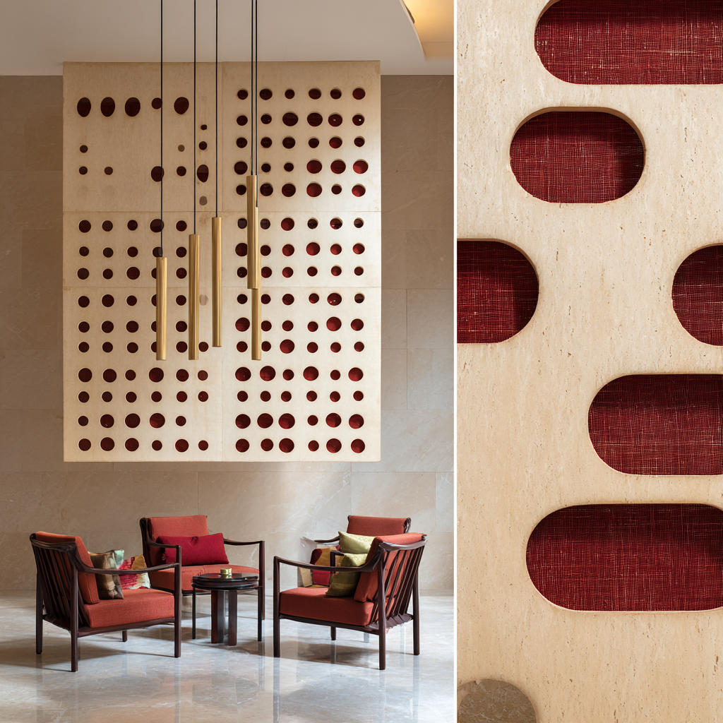 This double-height residential lobby balances the architectural weight of travertine and dark bronze with a radical synthesis of clay and textile. The centerpiece is a pale terracotta wall panel featuring a geometric grid of hand-carved oval perforations, each intricately laced with Kanchipuram silk. This legendary Indian textile, rendered in temple red and zari gold, is hand-woven directly through the clay substrate to create a living, tactile surface suspended from a minimal iron rod. The interplay of natural light across the silk-through-clay boundary highlights a masterclass in material tension—where the primal earthiness of terracotta meets the refined, metallic luster of traditional silk-weaving. This composition elevates the lobby into a gallery of "quiet luxury," blending ancient artisanal heritage with a clean, contemporary residential aesthetic.
